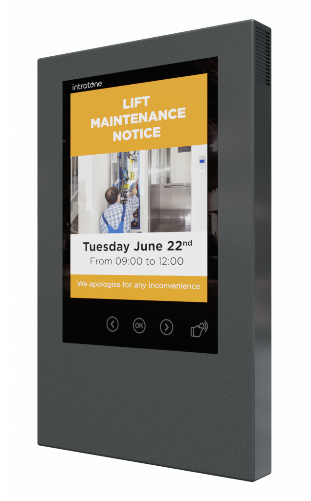 Met de Info Displays van Intratone kunnen woning- en vastgoedbeheerders ervoor zorgen dat zij snel en efficiënt informatie kunnen delen met huurders en bewoners. Met behulp van het centrale online beheersysteem van Intratone kunt u binnen enkele seconden een bericht via uw computer naar het scherm uploaden, waar u ook bent en waar het display ook hangt.