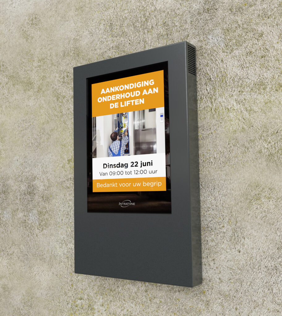 Het info display van Intratone is geschikt voor zowel binnen- als buitengebruik, zodat de bewoners – waar u het ook nodig heeft – zo snel mogelijk toegang hebben tot de meest cruciale informatie.